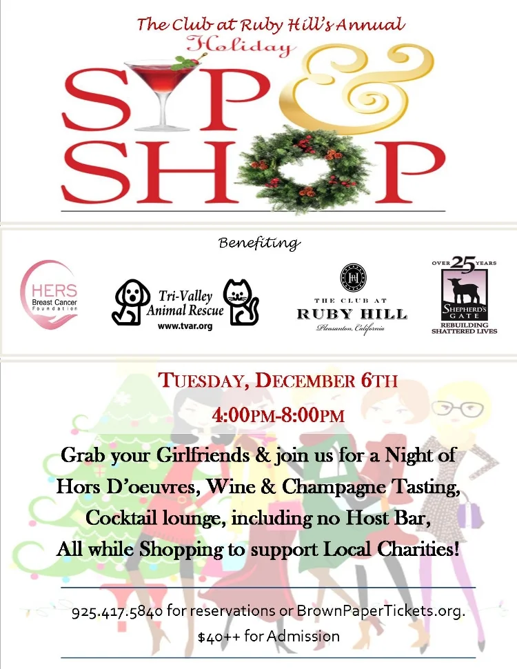 Sip and Shop at Ruby Hills Tuesday, December 6, 2016 1:00 PM 5:00 PM 13:00 17:00 Google Calendar ICS More details about this event at there FACEBOOK event page