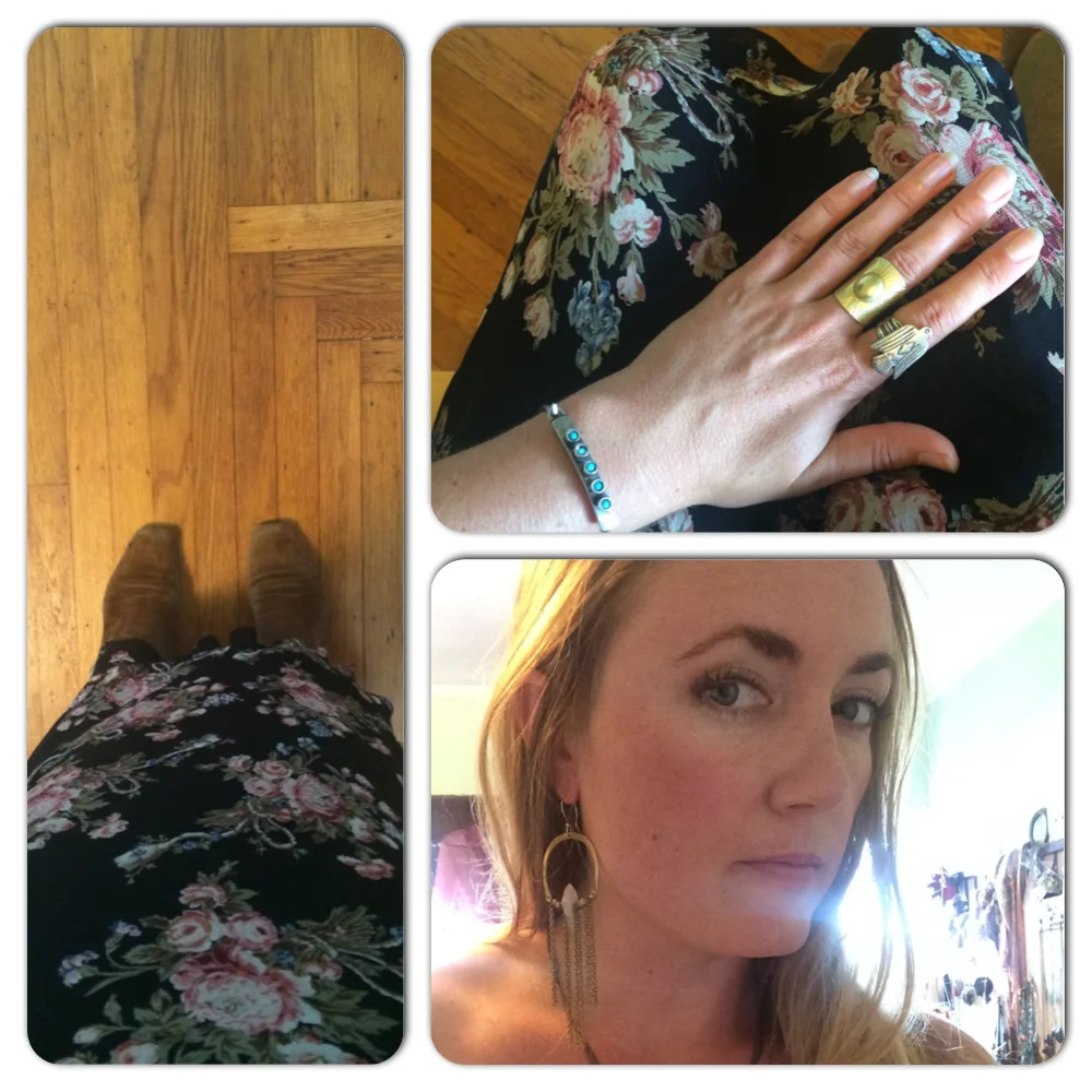 Wearing. . . well, if you follow my Listening-Wearing-Making posts much you've probably noticed that I mostly wear skirts and dresses. This has been the case for most of my adult life (with a few intermittent years where I wore either colorful courdoroys or skinny jeans) mainly because I find them to be so much more comfortable than pants. That, and it is infinitely easier to find cute skirts and dresses that fit at thrift shops than it is pants of any kind. This particular dress was a slam dunk find with it's sheer white floral patterning. . .